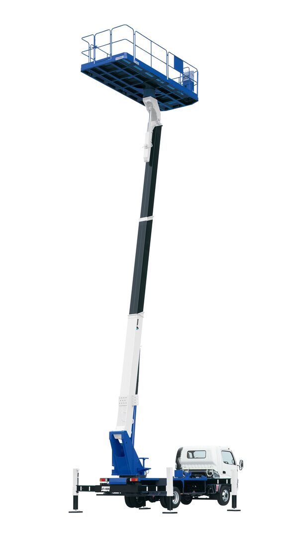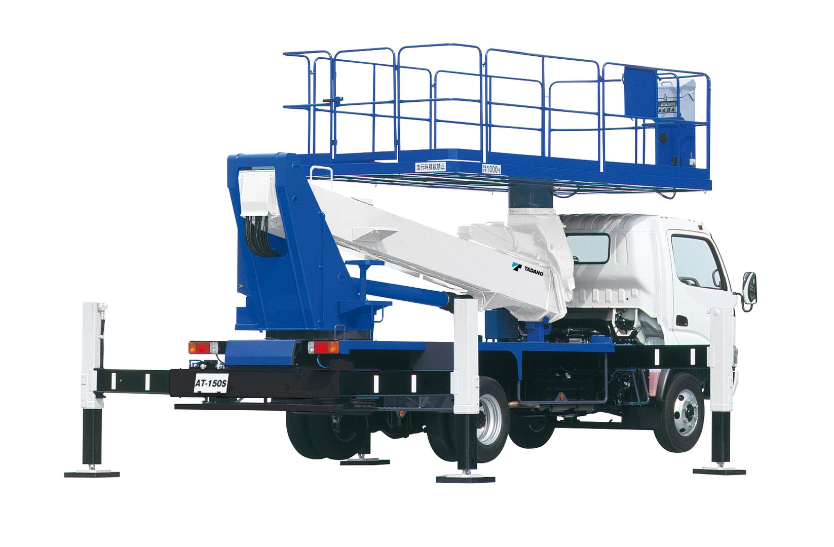 Super Deck AT-150S offers the maximum 14.8m platform floor height. This model can be mounted on medium duty trucks. 4 motion control achieves free movement of the deck. Direct movement from point to point, in any direction. A large deck is suitabule for loading of noise prevention panels, pipes, and other materials. Noise prevention panel installation or signboard installation can be performed efficiently, and workers have a spacious deck to work on.