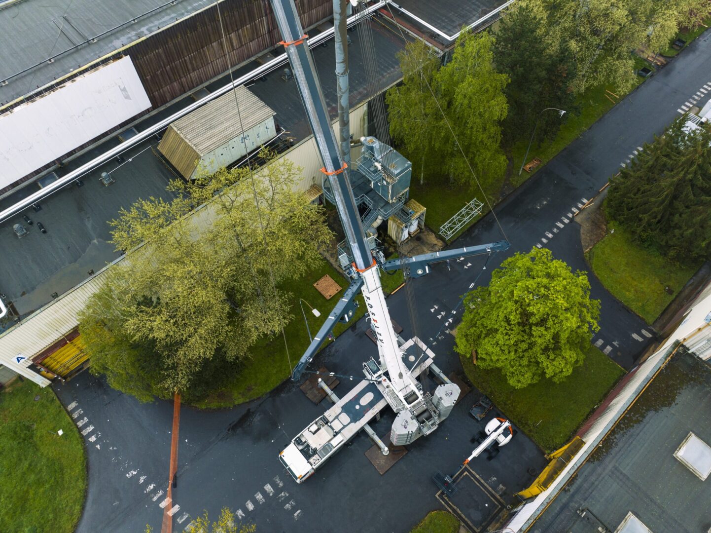 It was quite a job for the Foselev crew and their Tadano AC 7.450-1 – and not just because of the large radius at which the load had to be lifted. The job site itself also presented a number of difficulties. For one thing, the cramped conditions were quite a challenge—albeit a challenge to which the AC 7.450-1 was more than equal, thanks to its compact dimensions in combination with the operator’s consummate maneuvering skills. The Surround View camera system was a huge help when it came to positioning the crane on the site. This patented system uses six crane cameras to show a computer-assisted diagram of the maximum possible extension lengths for the outriggers at the crane’s location. It also allows the system to detect the maximum possible slewing radius. “This eliminates tedious and time-consuming measurements and testing when looking for a location from which to operate the crane. As a result, the crane is ready for use faster,” explains crane operator Willy Baumann. Meanwhile, during the lift itself, the crane’s slewing movements were restricted by lamp posts and trees. But that’s where the AC 7.450-1 machine’s advanced IC-1 Plus crane control system with working range limiter came into its own, a huge help for the operator. Another important feature that proved extremely valuable at Stellantis is the remote control, which Baumann used to great effect during the lift. “To get the air handling unit onto the roof, we had to lift it out over protruding edges that largely obstructed our line of sight from the crane,” he explains. “But the remote control solved this problem.”
