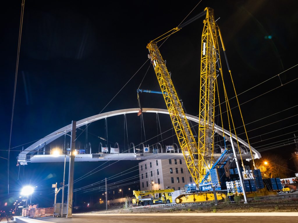 Il fallait donc éviter à tout prix le moindre retard au cours de cette intervention, et ce depuis le montage de la grue jusqu’à son démontage et son évacuation en passant par l’opération de levage elle-même. Le chantier se trouvait en effet en plein centre-ville, à la gare de la petite ville d’Hazebrouck, située dans le nord de la France. La passerelle pour piétons d’une longueur de 75 m et d’un poids de 250 tonnes, prévue pour relier la gare à un parking, devait être soulevée « d’un seul tenant » au-dessus de huit voies de chemin de fer, déplacée, tournée et finalement déposée sur ses fondations. À cet effet, il a fallu mettre hors tension les lignes à haute tension au-dessus des voies pendant la durée de l’intervention.