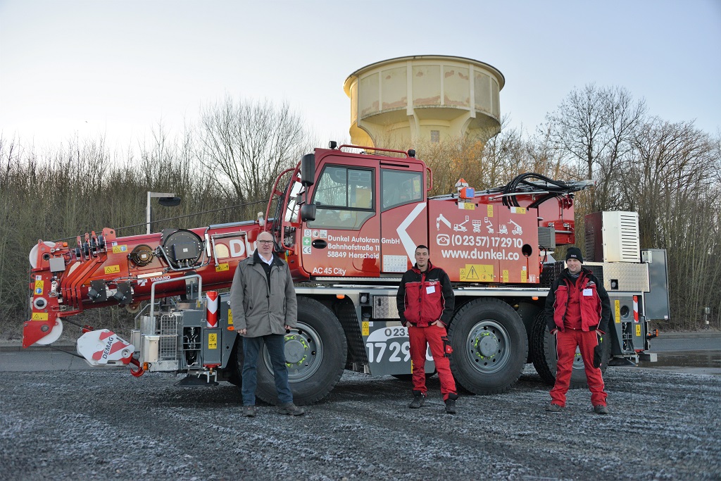 Left to right: Manfred Drößer (Sales Manager, Tadano) – Sebastian Dunkel (Managing Director, Dunkel Autokran GmbH) – Oliver Weckwerth (Crane operator, Dunkel Autokran GmbH)