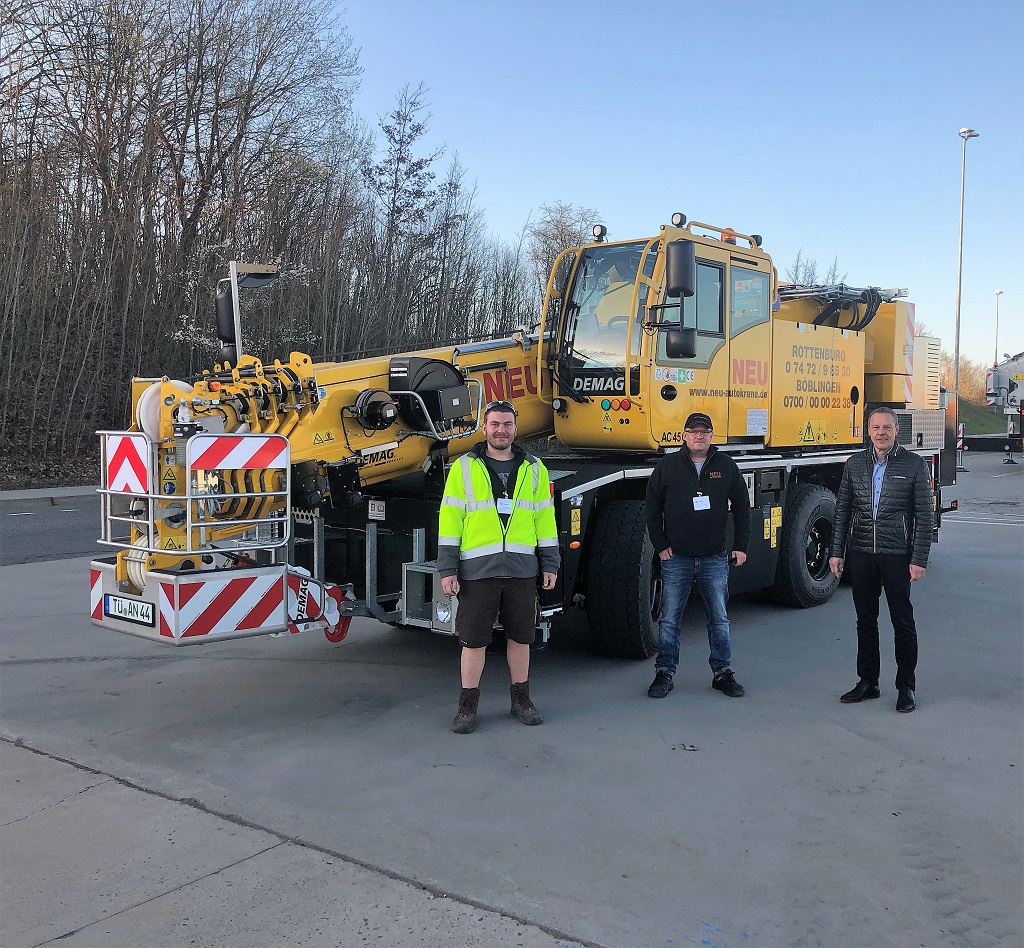 The team at Autokrane Neu, which is headquartered in Rottenburg am Neckar, is certainly no stranger to Demag cranes: “We’ve had an AC 40 City in our fleet for a long time now, and it’s done its job so well that we decided to get it some company in the form of an AC 45 City,” reports crane operator Christian Morres, who picked up the new City in Zweibrücken. The crane was handed over by Tadano Sales Manager Michael Zieger.