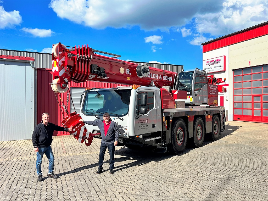 Managing Director Kurt Kölch had decided to pamper himself a bit: It was the year of his 50th work anniversary, so it only made sense to take delivery of the 50th crane in the history of his company – a brand new Tadano AC 3.055-1 all terrain crane that he picked up together with Co-Director Alexander Kölch at the Tadano facility in Lauf. The “anniversary gift” was handed over by Tadano Sales Manager Thomas Keckeis.