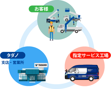 当社製品を”安全・安心”してご使用いただけるよう、タダノのサービスネットワークで、お客様をサポート致します。当社製品に関してのお問合せは、お近くの当社指定サービス工場または当社支店・営業所へご連絡ください。