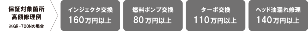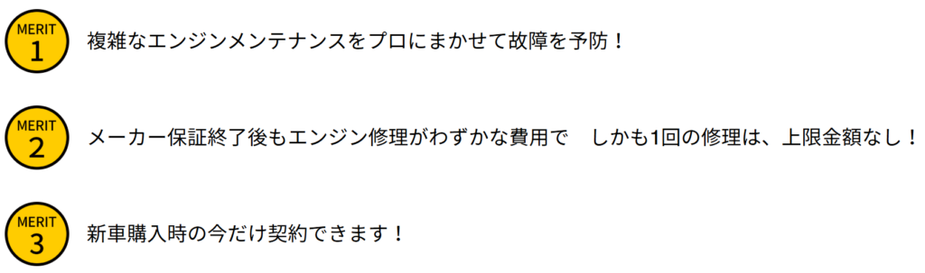 エンジンの修理費用は決して安価なものではありません。保証延長期間内に発生した修理が、1件につき30,000円の自己負担でカバーできます。