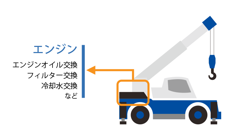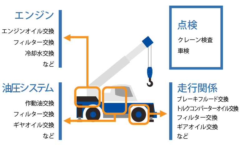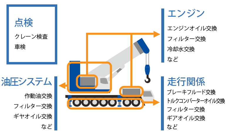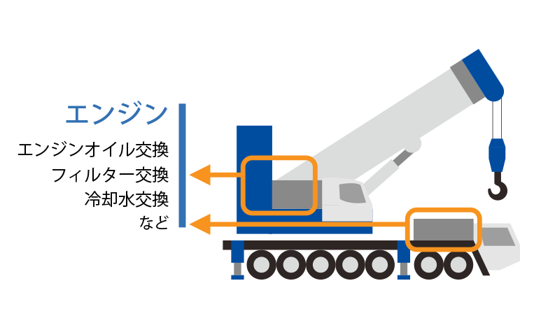 クレーン部分~走行部分(エンジン含む)までをカバーしたメンテナンスメニュー。