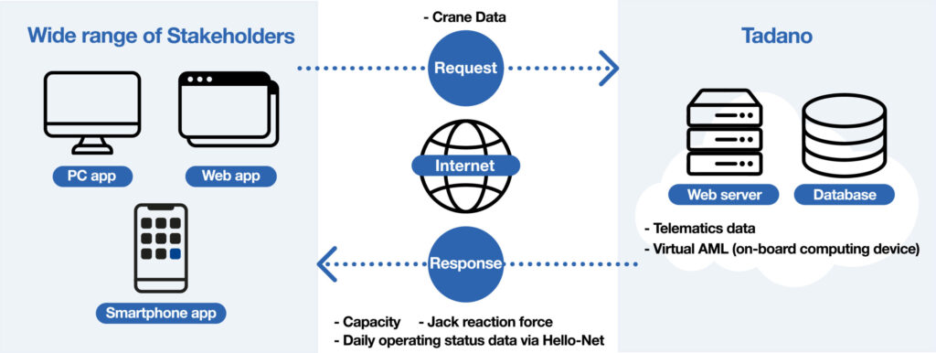 Tadano’s “Lift API Services” embrace Web API technology that allows, for example, crane performance calculation functions and telematics data to be used by directly linking systems with web apps, smartphone apps, core systems, and more. There is no established screen.