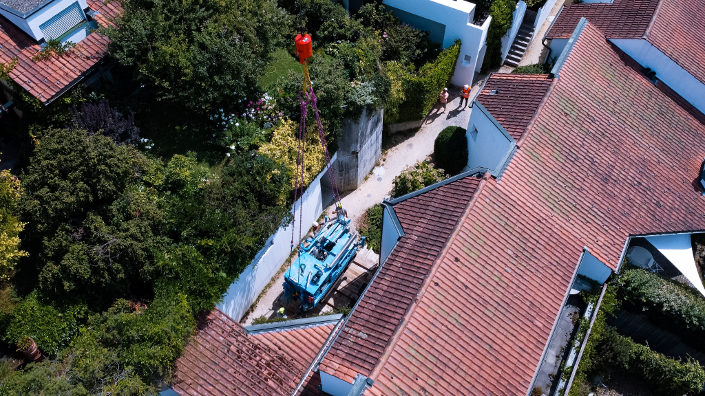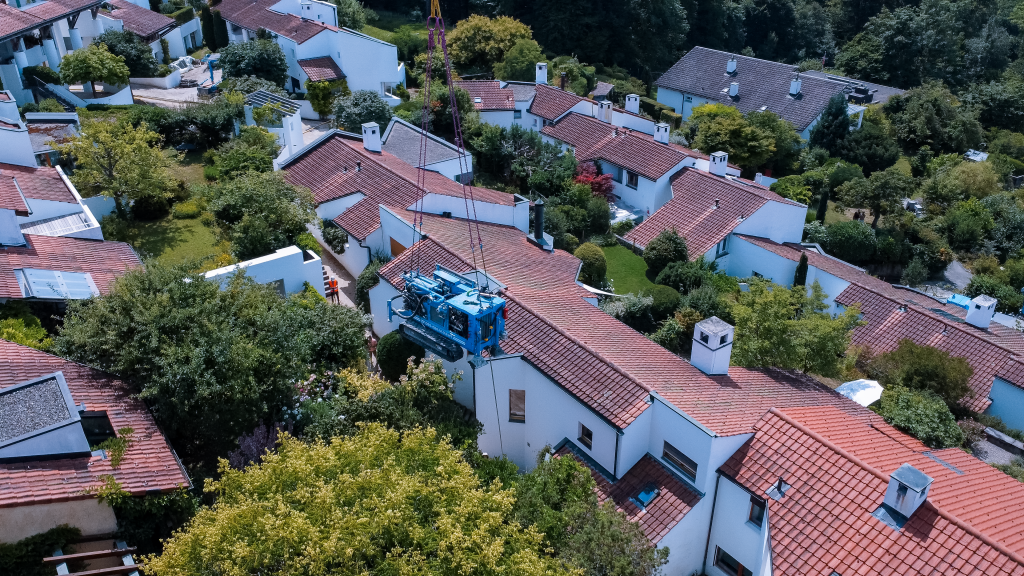 The specific project consisted of placing a multi-part drilling rig at various locations in a residential area in Zumikon, close to Zurich, so that the rig would be able to drill holes for ground loops for geothermal heat pump systems. The challenge: The residential area offered precious little space for maneuvering a large crane, and traveling between the houses to get to the drilling sites directly was simply not possible. “That meant that we had to move the three-part drilling rig to each drilling location all the way from the edge of the residential area each time,” reports crane operator Robert Wendelspiess.
