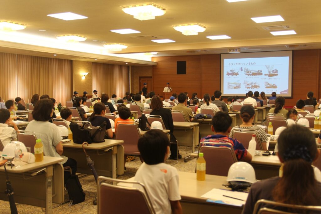 Out of the many applicants, 40 pairs of parents and children were lucky enough to be selected by lottery to visit the Shido Plant this year. On a scorching hot day with the maximum temperature exceeding 35°C, the program began in a cool room with the company introduction. Participants were given an overview of Tadano including product lineup, domestic and overseas production sites, and the manufacturing process of leading up to the completion of a crane.