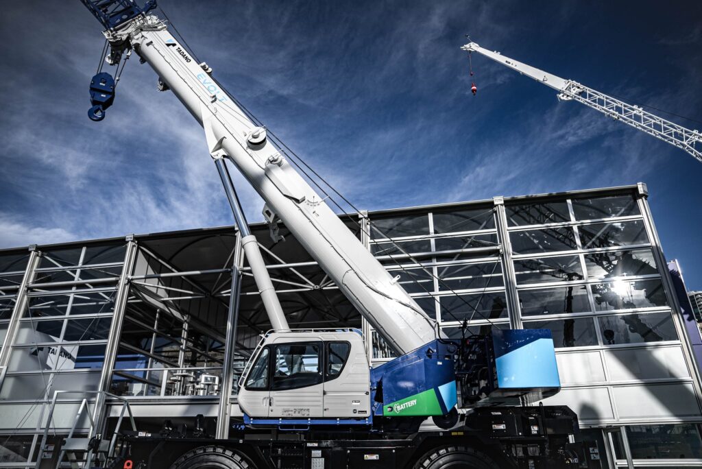 In April 2021, Tadano announced that it was working on a fully electric rough terrain crane, which is now scheduled to be showcased at this year’s ConExpo to industry members for the first time ever as a fully functional prototype. Its name? The GR-1000XLL EVOLT. The crane can travel to work sites and take care of all lifting operations there exclusively with energy supplied by its batteries, making fully zero-emission operation possible. A single battery charge is enough for up to nine hours of crane operation, or five hours of crane operation with a travel distance of up to 12.5 miles (20 km). Meanwhile, the charging time is a mere two hours with fast charging on a US-COMBO CCS1 connection and only about seven hours with normal charging on a three-phase 240 VAC, 100 A commercial power supply connection. In addition, unlimited operation with the crane plugged into a power outlet is available as well. The powerful electric motor delivers a maximum output of 194 kW, ensuring that the GR-1000XLL EVOLT has the equivalent lifting capacity and operating speed as its diesel-driven sibling, the GR-1000XLL-4. But where the GR-1000XLL EVOLT truly stands apart from its diesel counterpart is environmental friendliness, with Tadano calculating savings of around 2,200 gallons of diesel and a resulting reduction of close to 22 metric tons of CO2 emissions a year for an average crane usage scenario. The corresponding launch is scheduled for 2024 in the USA and Canada at first.